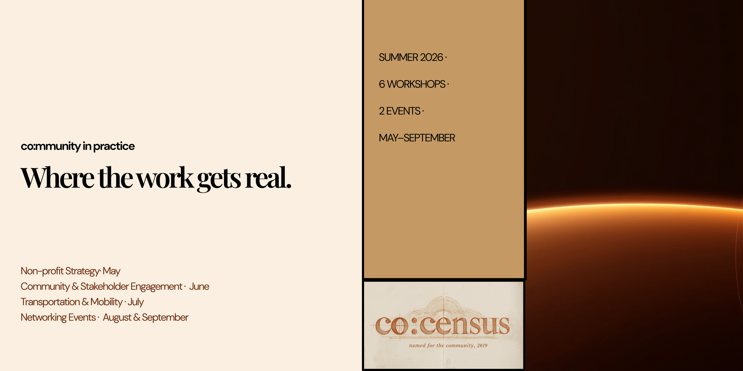 The co:mmunity in practice Series Pass is your all-access ticket to every session in our 2026 learning series — six workshops and two in-person convenings running May through September in New York and virtually.